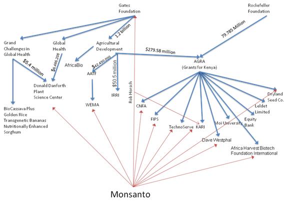 the money from the Gates Foundation and * Not all of the work that the Gates Foundation is doing around GMOs is obvious; research into genetically engineered sorghum, bananas, rice, and cassava is being funded through its separate initiative, Grand Challenges in Global Health, under claims of adding nutrition. * In addition, the Gates Foundation is also funding organisations that are known for influencing African government policies to allow for the use of GMOs, such as AfricaBio and Africa Harvest Biotech. *