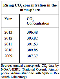 Carbon dioxide concentrations in atmosphere reach record level For the first time in human history, the average level of carbon dioxide in the atmosphere has exceeded 400 parts per million for an entire month. Indrajit Bose GREENHOUSE gas (GHG) concentrations in the atmosphere are progressively increasing. For the first time in human history, and likely for the first time in at least 800,000 years, the average level of carbon dioxide (CO2) in the Earth's atmosphere has exceeded 400 parts per million (ppm) for an entire month. The average CO2 value for the month of April was 401.33 ppm and each day in April had a reading above 400 ppm, revealed scientists at the Scripps Institution of Oceanography in San Diego, USA. Scripps oversees a Keeling Curve, which is the longest continuous record of CO2 measurements since the late 1950s over the Mauna Loa volcano in Hawaii. The April record is in line with the warnings that the Intergovernmental Panel on Climate Change (IPCC) issued through its working group reports. Unprecedented 'The atmosphere and ocean have warmed, the amounts of snow and ice have diminished, sea level has risen, and the concentrations of greenhouse gases have increased,' said the IPCC's Fifth Assessment Working Group I report. The report also added that warming of the climate system is unequivocal and many of the observed changes are unprecedented over decades to millennia. In fact, the past three decades have been successively warmer. In the Northern Hemisphere, 1983-2012 was the warmest 30-year period in the past 1,400 years (see box). The IPCC's Working Group III report also warned that in spite of the growing number of mitigation policies worldwide, the annual GHG emissions grew on average 1 Gt CO2eq per year from 2000 to 2010. Without additional mitigation, the world may be headed to a 3.7-4.8øC temperature increase by the end of the century. The worry is the pace at which GHG concentrations are increasing in the atmosphere (see table). Carbon dioxide levels were about 280 ppm before the Industrial Revolution, when humans first began releasing large amounts into the atmosphere. For the past 800,000 years, CO2 levels never exceeded 300 ppm, according to Scripps. The IPCC attributes the rising atmospheric concentrations of CO2 since 1750 to human activity. The Working Group I report states that anthropogenic GHG emissions have increased by 10 Gt CO2eq per year between 2000 and 2011. In 2011 the concentrations of these GHGs were 391 ppm. In a space of three years, this has risen to over 400 ppm. CO2 emissions averaging 400 ppm for a month is new and something that the world needs to worry about. 'Constantly pumping CO2' 'An increase of 0.5 ppm of CO2 indicates an addition of 3.66 Gt of CO2 equivalent to the atmosphere. It is clear that the world is constantly pumping CO2 in the atmosphere,' said PS Swathi, senior principal scientist with the Fourth Paradigm Institute, formerly the Centre for Mathematical Modelling and Computer Simulation, in Bangalore, India. The increase in CO2 emissions is indicative of two important things, says Swathi. 'One, sources of CO2 are increasing, and two, the potency of carbon sinks, which absorb some of the CO2, thereby giving respite to emissions increase, may be decreasing.' NK Indira, another senior principal scientist with the Fourth Paradigm Institute who looks at three such observatories in India, says Indian monitoring stations also show similar results. 'The data from the Indian Astronomical Observatory at Hanle in Ladakh in northern India shows that CO2 concentrations ranged between 396 ppm and 399 ppm in 2013. The station at Pondicherry, a Union Territory in southern India, too showed similar concentrations of CO2 in the atmosphere,' said Indira. Data for 2014 is awaited, and is likely to be published soon. It is thus clear that rising concentrations of GHGs have to be contained to avoid catastrophic impacts of climate change, and this is crucial to factor in, in the global climate change negotiations, which are trying to arrive at a global deal on climate change in 2015. Indrajit Bose is a senior researcher on climate change with the Third World Network. *Third World Resurgence No. 285, May 2014, p 21 |