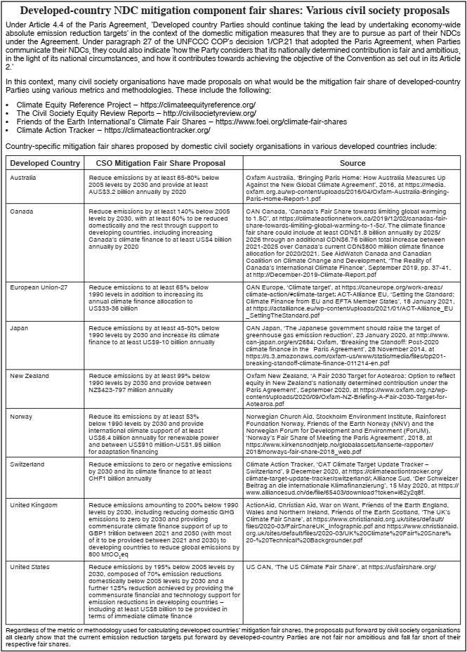 In Paris in 2015, the only consensus possible in order to accommodate mainly the US was through the acceptance of a bottom-up approach, which paved the way for ‘nationally determined contributions’ (NDCs) under which each country would pledge what it can do voluntarily without any methodology to assess if such reductions are consistent with equity or fairness. In fact, analysis by serious academics and progressive civil society groups has pointed out that rich countries are not doing enough at all and are very far away from what is needed to limit temperature rise. For instance, one recent analysis ‘rooted in the principle of equal per capita access to atmospheric commons’ by Dr. Jason Hickel from the University of London, reported in The Lancet,4 pointed out that ‘As of 2015, the USA was responsible for 40% of excess global CO2 emissions. The European Union (EU-28) was responsible for 29%. The G8 nations (the USA, EU-28, Russia, Japan, and Canada) were together responsible for 85%. Countries classified by the UNFCCC as Annex I nations (i.e, most industrialised countries) were responsible for 90% of excess emissions. The Global North was responsible for 92%. By contrast, most countries in the Global South were within their boundary fair shares, including India and China (although China will overshoot soon).’ The Third World Network also compiled a table of what emission reductions of selected developed countries ought to be from a fair-shares perspective according to civil society groups (see box). The table shows the actual effort needed from developed countries in terms of emissions reductions, including the level of finance that they should be contributing to developing countries as part of their fair shares. Instead of focusing on what the emission reductions ought to be from a fair-shares perspective in order to keep within the remaining carbon budget in an equitable way, the net-zero mantra allows developed countries to get away with targets which amount to doing too little too late, and passes on the responsibility to developing countries to do the heavy lifting, without commensurate finance and technology transfer. If COP 26 is to be a success, its outcomes must reflect equity between developed and developing countries and must not undermine the principle of common but differentiated responsibilities and respective capabilities (CBDRRC) which underpins the implementation of the Paris Agreement. Equity between countries as underlined by the CBDRRC principle is the foundation of the UNFCCC, reflecting the historical responsibilities of developed countries for much of the greenhouse gas emissions since the Industrial Revolution, and the different capacities between the North and the South. In the negotiations on the PA, how equity and CBDRRC would be reflected in the new agreement was hugely contested along North-South lines, with the US – led by John Kerry, the climate envoy under the Obama administration then (and now under Biden) – leading the charge in an effort at obliterating the principle and blurring the differentiation between developed and developing countries. This effort was thwarted in Paris by a strong group of Like-Minded Developing Countries (LMDC), which led to the PA’s Article 2.2. However, attempts at undermining equity and CBDRRC in the implementation of the PA obligations have not stopped, as exemplified by the push towards net zero by 2050. The PA does call for a balance between human emissions and removal by sinks by 2050, but this is to be on the basis of equity and in the context of sustainable development and efforts to eradicate poverty. This is a global aspiration and not a country-wise aim. It cannot be country-wise, as this would lead to inequity. The success of COP 26 is predicated by mainstream media on ‘major emitters’ updating and revising their climate targets to more ambitious levels, including in promising net-zero targets. Setting such expectations for the success of the COP is not only unrealistic but also, with regard to the claims that the net-zero targets are ambitious, misleading. Such net-zero targets for developed countries are neither ambitious nor equitable from the perspective of developing countries. Instead of respecting equity and the CBDRRC principle, such calls for common action would lead to the sharing of responsibilities without differentiating between developed and developing countries and their different capabilities. Instead of CBDRRC, they promote the notion of ‘common and shared responsibilities,’ thus undermining equity between the rich and poor, North and South. While it is well acknowledged that all countries have to do more in terms of improving their NDCs so as to limit temperature rise to 1.5°C, expecting similar actions between developed and developing countries is not only grossly inequitable but also misleading as it will not solve the climate crisis. Following postponement of COP 26 from last year due to the unprecedented COVID-19 pandemic, governments especially in the developing world are facing huge challenges dealing with the triple crises of health, economic recovery and climate change. The poorer economies, in particular, are having to borrow more money and getting further indebted as they try to keep their health systems intact and as they face growing poverty and unemployment caused by the effects of the pandemic on their economies. For many rich economies, adequate vaccine access to tackle the pandemic has been secured, but this is not the case for most of the world’s poor countries, which are still struggling to get the needed supply. The Western world is also opposing proposals by developing countries to waive intellectual property rules in order to remove barriers to the development, production and approval of vaccines, therapeutics and other medical technologies necessary to combat the pandemic, so that more manufacturers, especially from developing countries, may indepen